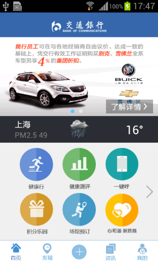 健康交行是交通银行推出的一款手机健身软件,用户可以通过这款软件追踪自己的运动路线,实时监控自己的云顶历程及所用时间,同时还可以通过这些数据精确计算自己运动所消耗的卡路里,让您对自己的运动状态了如指掌,快来下载体验吧!
