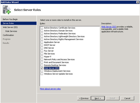 2. 鐐瑰嚮“Add Roles”娣诲姞鏈嶅姟鍣ㄨ鑹诧紝鍦ㄨ繖閲岄夋嫨Web Server锛圛IS锛夛紝濡備笅鍥炬墍绀猴細