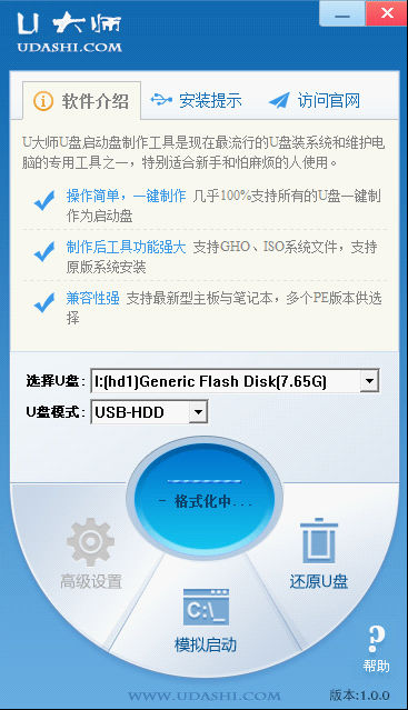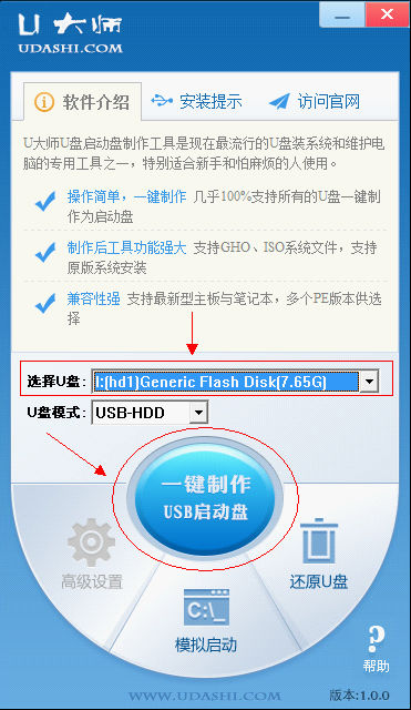第二步:用U大师“U盘启动盘制作工具”制作启动U盘。