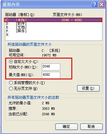 右键单击“我的电脑”选择[属性][高级],在性能栏点击“设置”“高级”在虚拟内存这一栏单击“更改”,虚拟内存的佳设置是把虚拟内存的初使值和大值都设置成一样,而值就是物理内存的2倍,比如512M内存就设成1024,依次类推,完成设置后,单击“应用”即可。