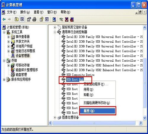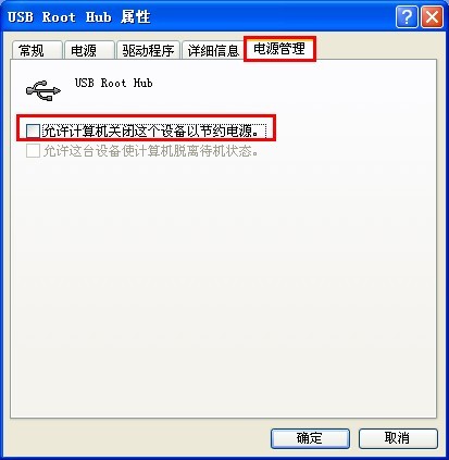 找到属于你的USB设备的“USB Root Hub”,双击它,在电源选项卡里把“允许计算机关闭此设备以节约电源”,这项前面的勾去掉,然后确定。