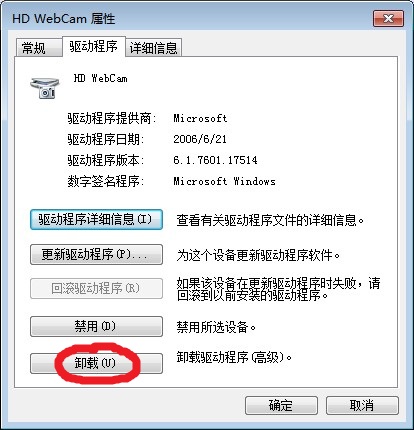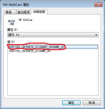 二、右键HD WebCam(就是USB视频设备)->属性,弹出如下对话框,已用红色毛笔将需要复制的信息勾出,将出现的硬件ID,用快捷键CTRL+C复制。