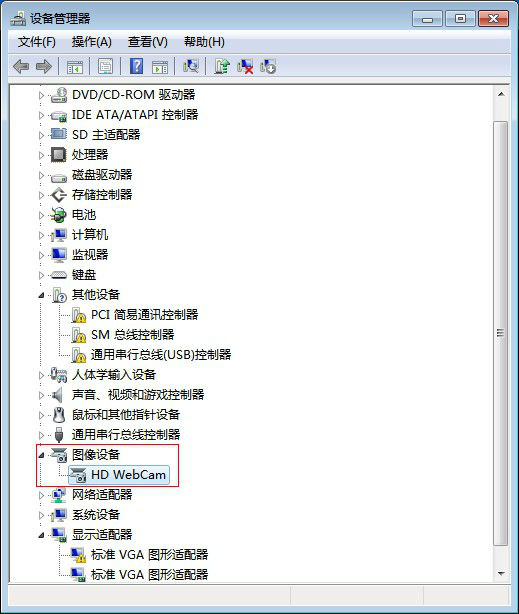 一、将电脑连通网络后,鼠标右键我的电脑打开设备管理器,找到图像设备如图: