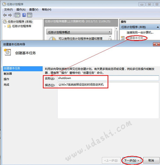 接着打开这个工具,会弹出“任务计划程序”窗口,单击右侧的“创建基本任务…”命令,就打开了“创建基本任务向导” 对话框。在“名称”文本框中,输入该任务计划的名称:shutdown,并在“描述”一栏中写上“让Win7系统按照设定的时间自动关机”再单击“下一步”按钮。以上操作见下图: