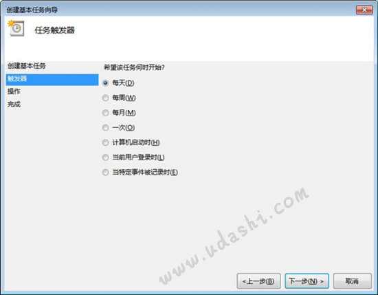 在“任务触发器”步骤中,选择合适的时间和频率,我们选择“每天”,这样在后面的步骤中才能选择固定的装机时间点,再单击“下一步”按钮:
