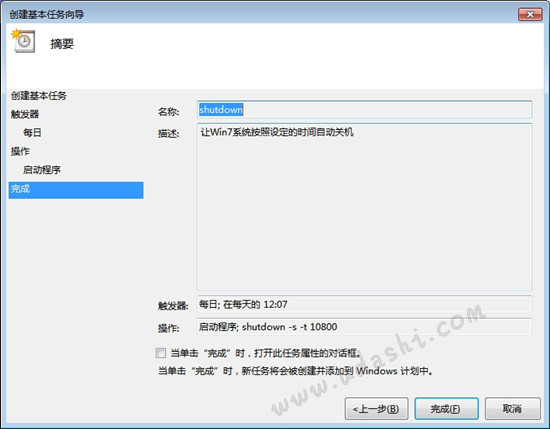 在后的窗口中,显示这个计划任务的配置内容,无误后单击“完成”按钮即可。
