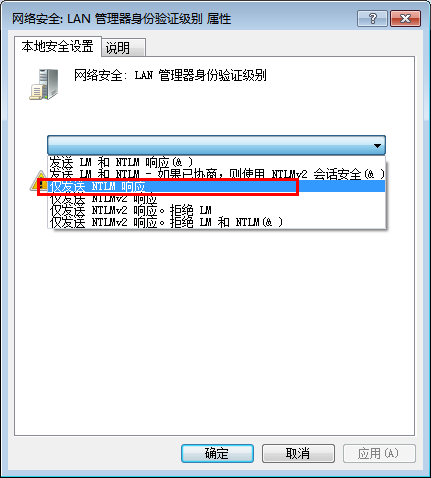 属性对话框中默认是"没有定义",更改为"仅发送NTLM响应“。