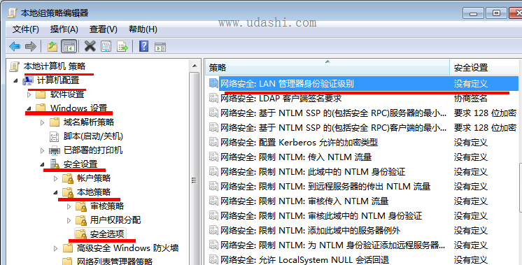 在弹出的“本地组策略编辑器”中依次选择“计算机策略—计算机配置—windows设置—安全设置—本地策略—安全选项“,双击”安全选项“,选择”网络安全:LAN管理器身份验证级别”,然后点击右键选择“属性”。