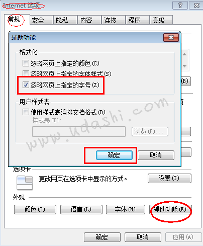 步、打开IE浏览器,点击属性栏的“工具”,然后依次选择“Internet选项—辅助功能”,在弹出的辅助功能对话框中将“忽略网页上指定的字号”选中,后点击“确定”保存修改。(如下图所示)