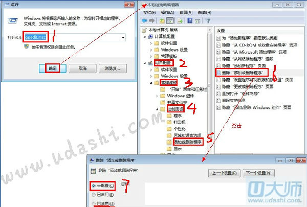 第二种方法:若是种行不通则:同上一样还是按住window+R键进入到“运行”窗口,在“打开”一栏输入gpedit.msc,点击“确定”按钮,进入到“本地组策略编辑器”找到“用户配置“并依次展开“管理模块”—“控制面板”,选择“添加或删除程序”并单击;接着在右部分窗口按“设置”找到删除“添加后删除程序”并双击,会弹出一个对话框,在上部分会有三个单钮选项,请选择“未配置”或“已禁用”,后点击“确定”就可大功告成了。以上详细步骤见下图: