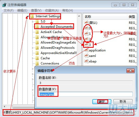 接着按先前的方法进入到“注册表编辑器”,依次找到HKEY_LOCAL_MACHINE\SOFTWARE\Microsoft\Windows\CurrentVersion\Internet Settings\Accepted Documents”,在右边右键“新建”->“字符串值” 紧接着大的数字命名,小编这里是2,故命名为3,并赋值为“image/png”,再单击“确定”(如下图所示)后重启一下IE就可以了。