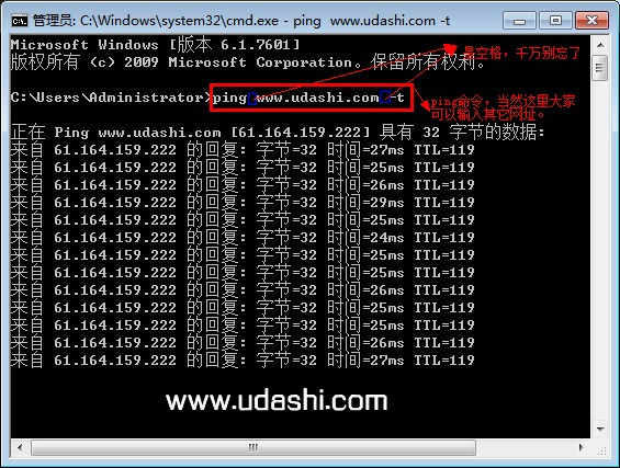 在弹出的“命令提示符”窗口中输入Ping命令,然后回车即可进入到网络测试界面,如图: