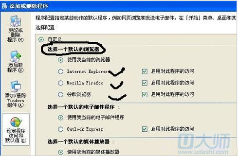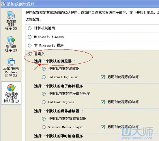 一、点击开始—控制面板—添加或删除程序—设定程序访问默认值—自定义,如图: