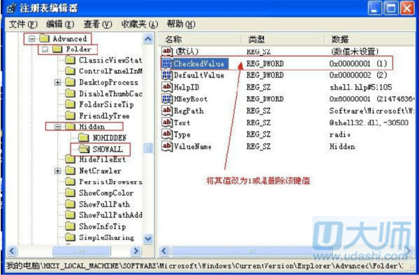 explorer\Advanced\Folder\Hidden\SHOWALL,然后在右侧窗口中找到Checked
