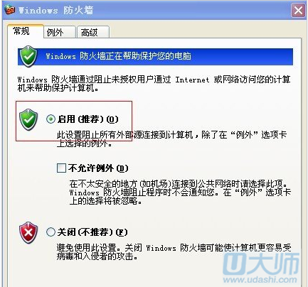 2.在本地连接上,点击“右键“后选择”属性“,切换到”高级“选项卡,进入”设置“,之后就会提示是否开启防火墙,选择”是“,如图: