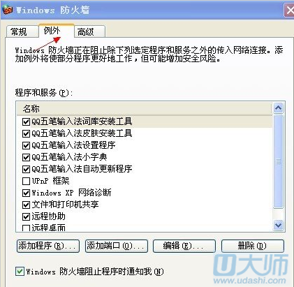 3.切换到“例外“选项卡,可以根据自己的实际需求,添加允许的端口,如图: