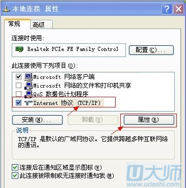 1.按照方法一中的步骤,打开“本地连接属性“窗口,选择”Internet协议“(win7选择IPV4),再选择”属性“,如图: