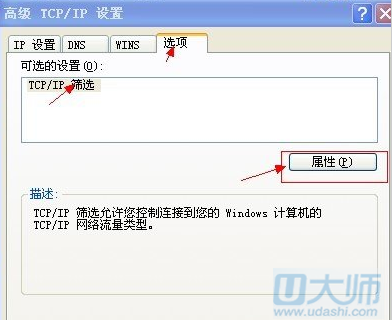 2.进入网络属性之后,点击底部的“高级“,弹出”高级设置“窗口,切换到”选项“,选择”TCP/IP筛选“,点击”属性“,如图: