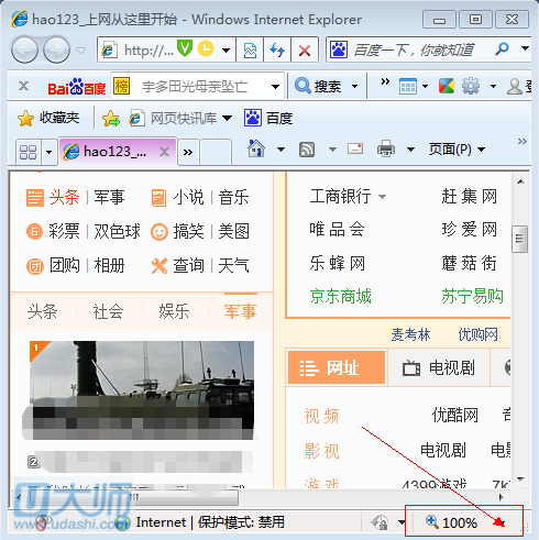 二、IE浏览器页面的右下角,一般都会有一个百分比显示,大家也可以根据自己的需要,选择适合的百分比,从而改变字体的大小,如图: