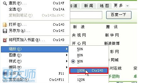 三、浏览器的标题栏一般都会有“查看”一栏,点击“查看”,选择“缩放”,选择合适的百分比,跟方法二一样调节字体大小,如图: