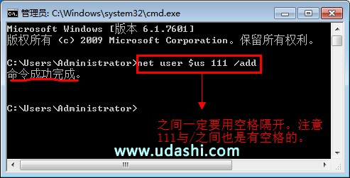第二步:进到命令提示符窗口后,输入net user $us 111/add命令(这里命令语句之间是以空格隔开的;命令中的$符号是的,可以理解为隐藏条件,密码为111),回车。待命令执行成功后关闭窗口。如图:
