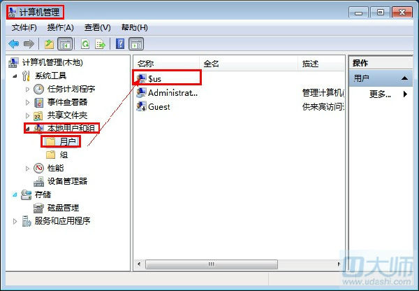 第三步:回到桌面,右击“计算机”à“管理”à“本地用户和组“à”用户“双击打开,这时你就会发现刚刚创建的用户$us。如图: