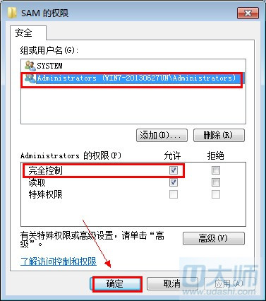 第五步:进到注册表编辑器中后,展开HKEY_LOCAL_MACHINE\SAM,双击SAM你会发现打不开SAM。这时请右键SAMà权限,Administrators的权限,在【完全控制】前打上勾,确定。此时我们可以关闭注册表窗口。重新打开并终实现SAM的目录打开。
