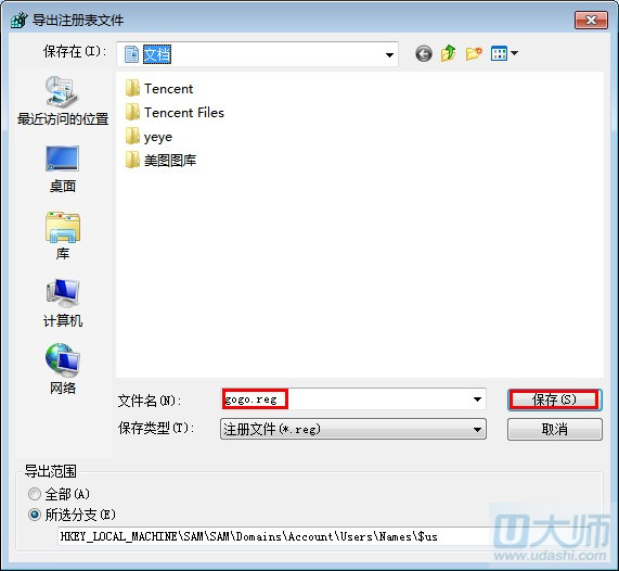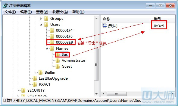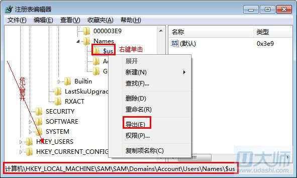 第六步:在第五步的基础上,在一次展开HKEY_LOCAL_MACHINE\SAM\SAM\Domains\Account\Users\Names \$us,右键单击$us选择“导出“,此时命名一个注册表文件.reg保存。如图: