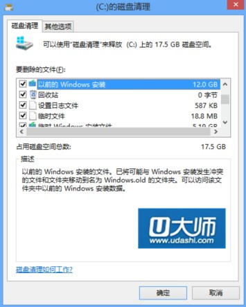第二步.在这里我们看到一个以前的windows安装有12G之多,把它勾选上,删除,在这里小编告诉大家删除这个12G文件是不会影响我们的系统的,单击“确定”按钮后,当询问“确实要删除这些文件吗?”时,单击“删除文件”按钮: