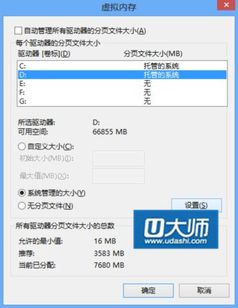 第五步.清除“自动管理所有驱动器的分页文件大小”前的复选框,然后在“驱动器[卷标]”下,单击D盘,选中“系统管理的大小”,单击“设置”按钮: