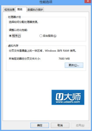 第四步.在“高级”选项卡,单击“性能”下的“设置”按钮,单击“高级”选项卡,在“虚拟内存”下,单击“更改”按钮: