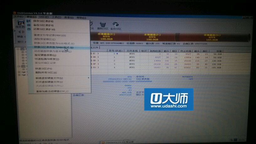 第四步.用pe的diskgenius重建分区为mbr:提示:无法转换到mbr分区表
