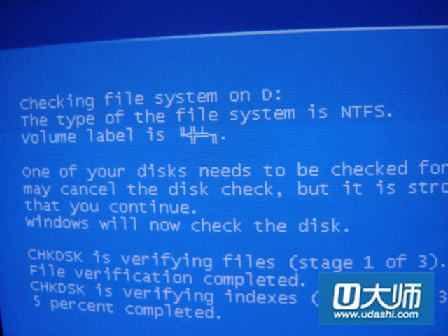 上图所示是系统在扫描硬盘,可能是操作的问题,非法关机,直接断电或者直接按电源关电,电脑开机的时候会对硬件做检查,包括硬盘。