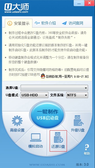 只要把上述图片红框位置也就是我们的还原U盘选项,那么就可以重新制作我们的U盘了,而这个方法同样适用把启动盘变成普通盘的。
