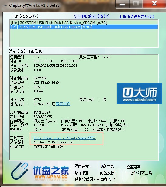 步.测试U盘主控,这里小编推荐芯片无忧,然后点击红框位置的网址下载量产工具,并不是U盘主控都是一样的,而不同的主控又要下载不同的量产工具今天小编就以自己的优盘为例,为大家带来量产额教程。
