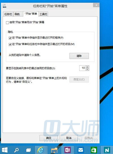 因为在windows10的技术预览版中直接“没收”了我们的开始菜单,若想使用开始屏幕的话请在任务栏右键选择出“任务栏属性”>开始菜单>取消“使用开始菜单而非开始屏幕”的选项。