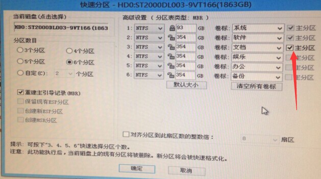 2、在分区工具中分区时将主分区选择多个激活(未激活的分区,将不能作为主分区装系统使用)