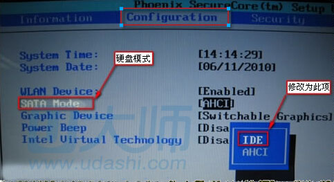 装xp与运行pe中,如果使用ahci模式可能会造成硬盘检测不到,因为它的兼容性没有ide硬盘模式强,于是在bios的configuration标签中找到sata mode项更改成ide