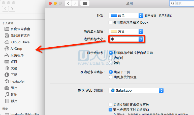 2.进入到通用后,点击边栏图标大小,选择中: