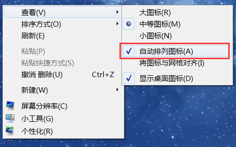 2.在电脑桌面空白处鼠标右键,点击查看,然后将自动排列图标前面的勾去掉: