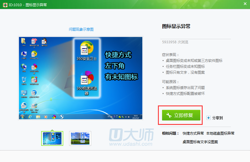 2.然后点击立即修复,返回桌面就会发现桌面上的异常图标已经修复好了: