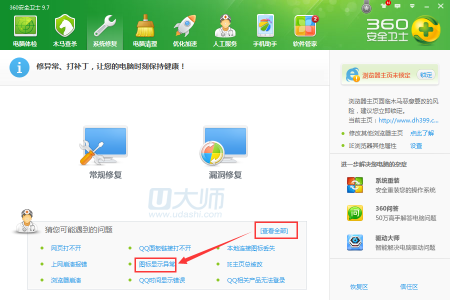 1.这时候就需要借助360安全卫士了,点击系统修复,在查看全部位置点击图标显示异常: