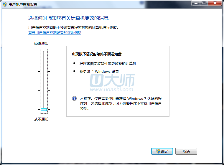 3.将滑动条滑到下方从不通知,即可关闭用户账户设置: