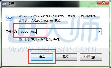 2、点开“开始”,在运行中输入“regedit.exe”,按下回车键或者是在桌面上输入组合快捷键“Win+R”,输入“regedit.exe”,点击“确定”进入“注册表管理器”