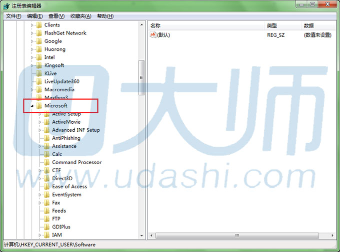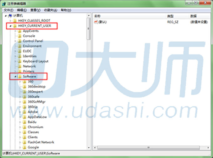3、在“注册表管理器”中选择“HKEY_CURRENT_USER”,然后选择其下的子文件夹“Software”