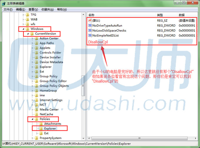 5、然后打开下面的“Windows”选择其下的子文件夹“CurrentVersion”,接着要找到里面的“Policies”,后选择这之下的“Explorer”,点击它,在右面窗口处选择“DisallowCpl”,右键单击删除它。