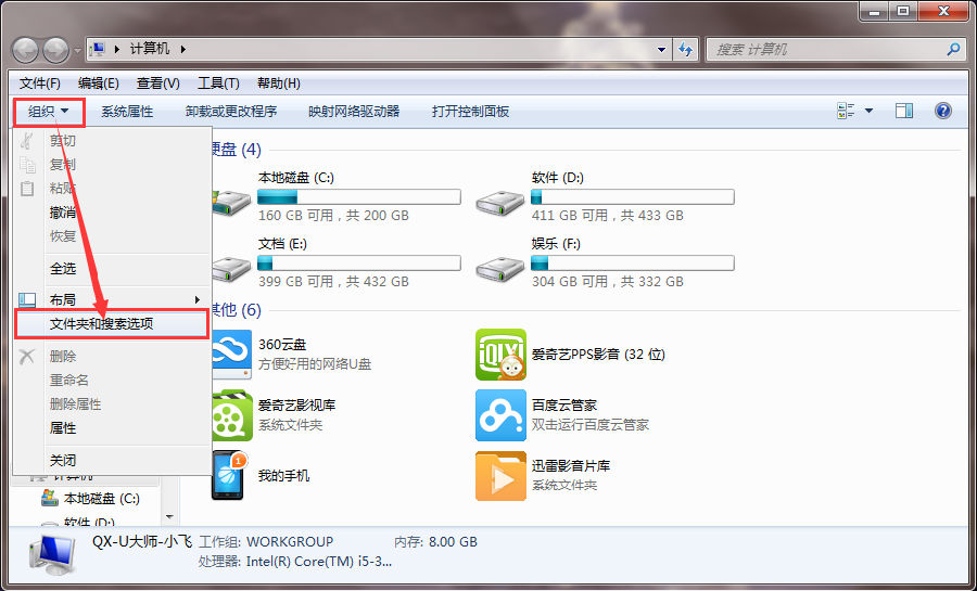 2.打开计算机,然后点击组织,选择文件夹和搜索选项: