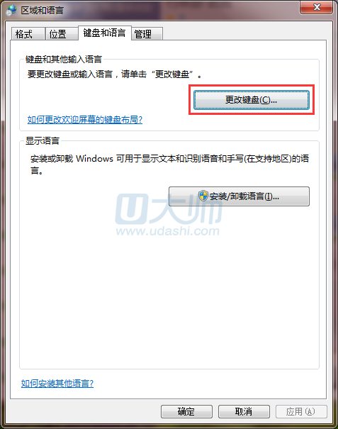 2.在区域与语言中找到键盘和语言,点击更改键盘:
