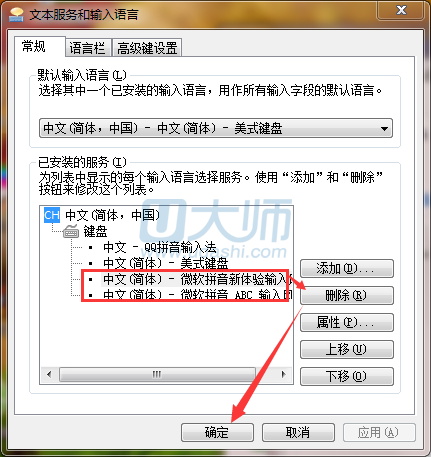 3.在常规界面,将微软的输入法进行删除,然后点击确定:
