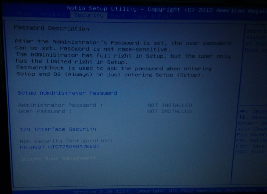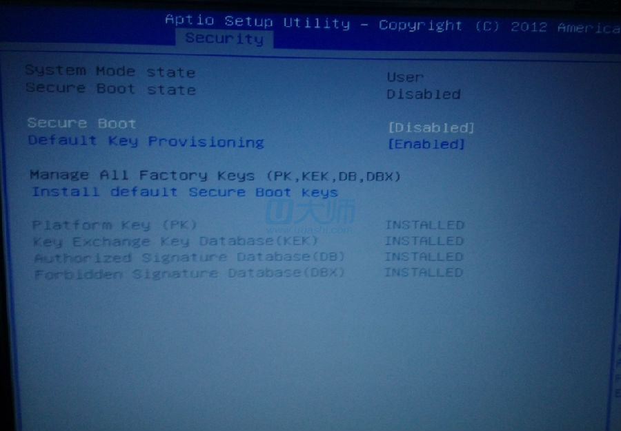 1.打开笔记本电源然后狂按F2,进入到bios后来到security目录找到secure boot management回车: